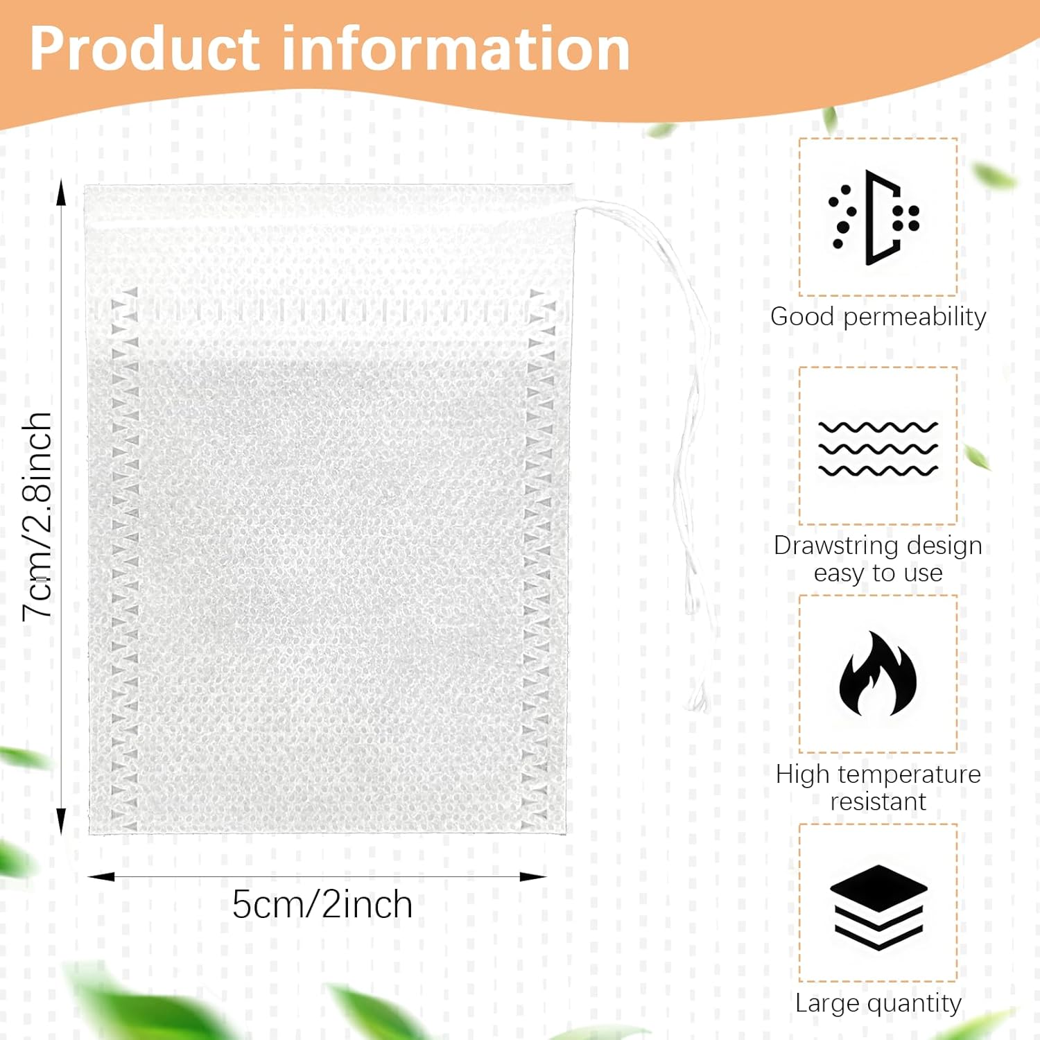 - Proper Size: the disposable tea filter bags measure about 2 x 2.8inches/ 5 x 7 cm in width and length, and the recommended amount of tea is less than 5 g the amount of powder is 5 g, so the capacity is enough for your multiple purposes
