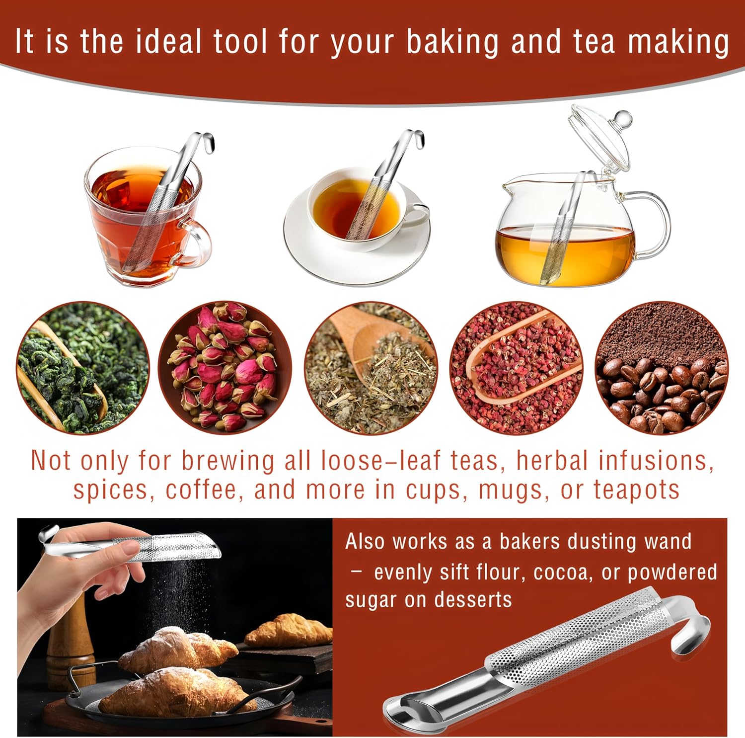 - 【Loose Tea Leaf Steeper】The premium tea diffuser ultra-fine mesh blocks even tea particles while maximizing flavor, not only for brewing all loose-leaf teas, herbs, and spices. The reusable tea infuser also works as a bakers dusting wand – evenly sift flour, cocoa, or powdered sugar on desserts! It is the ideal tool for your baking and tea making