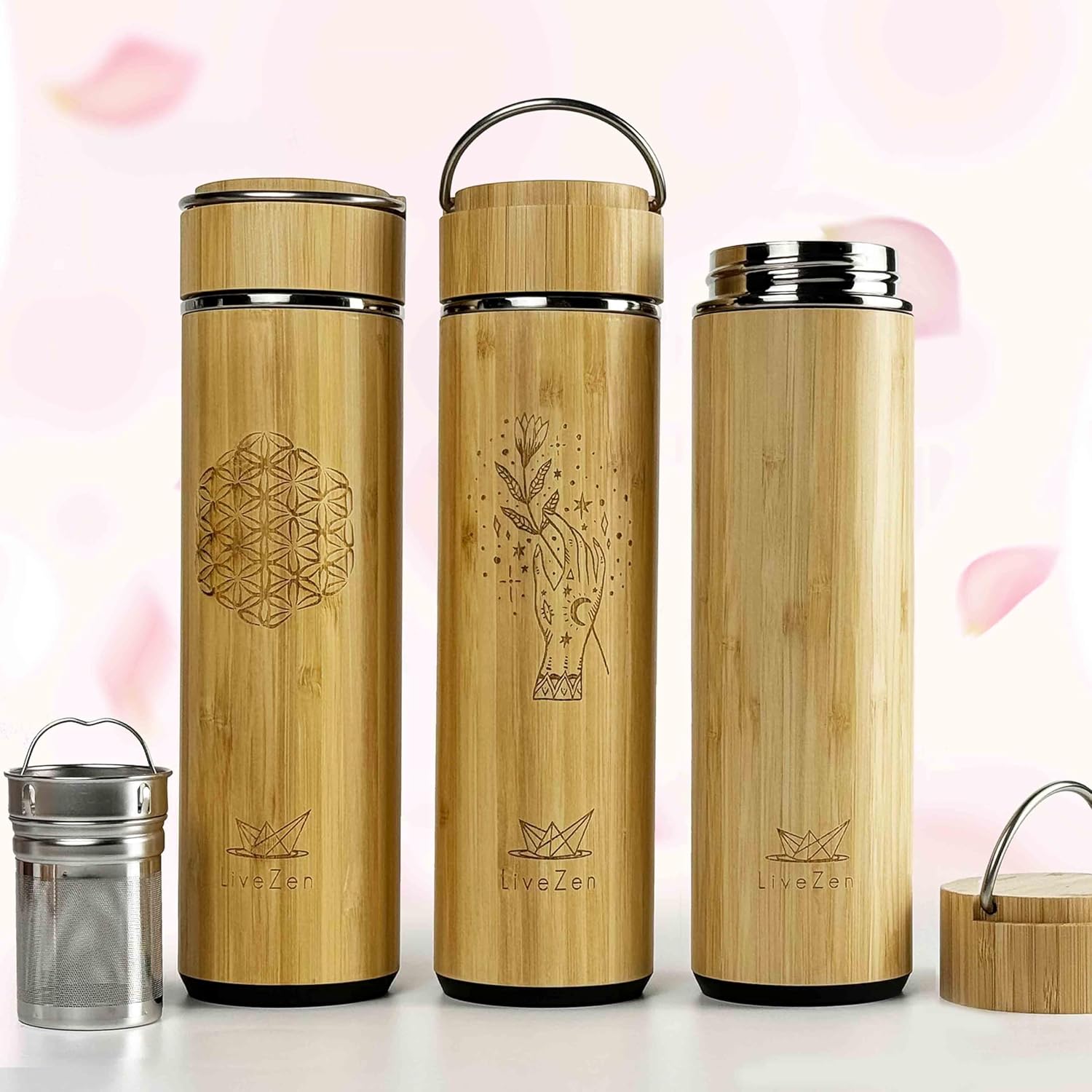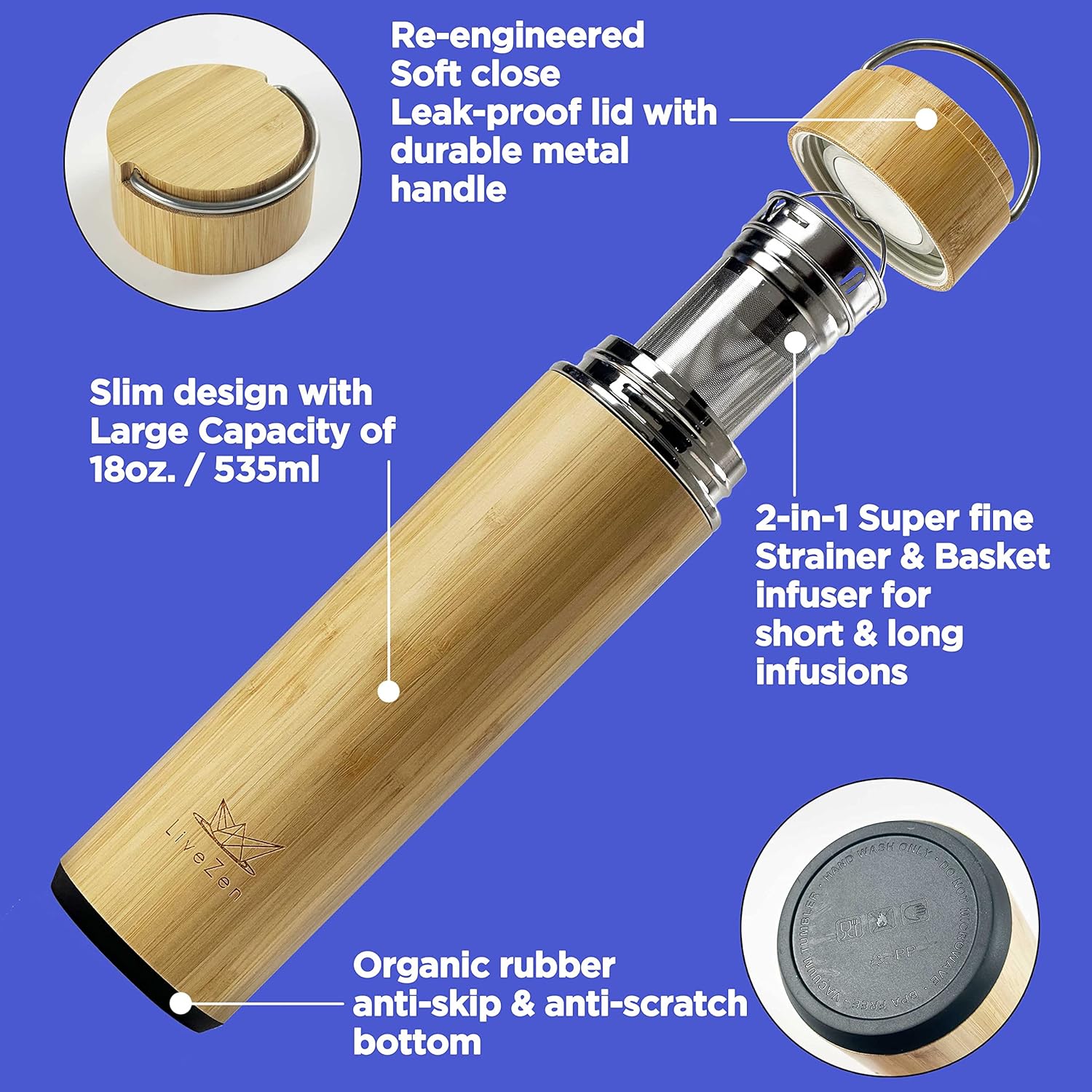 LiveZen 18oz Bamboo Tea Tumbler with Lid and 2 Pack Tea Filters for Loose Leaf Tea u2013 Stainless Steel Insulated Tea Infuser Bottle with Strainer u2013 Tea Gift Set for Tea Lovers Men Women