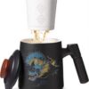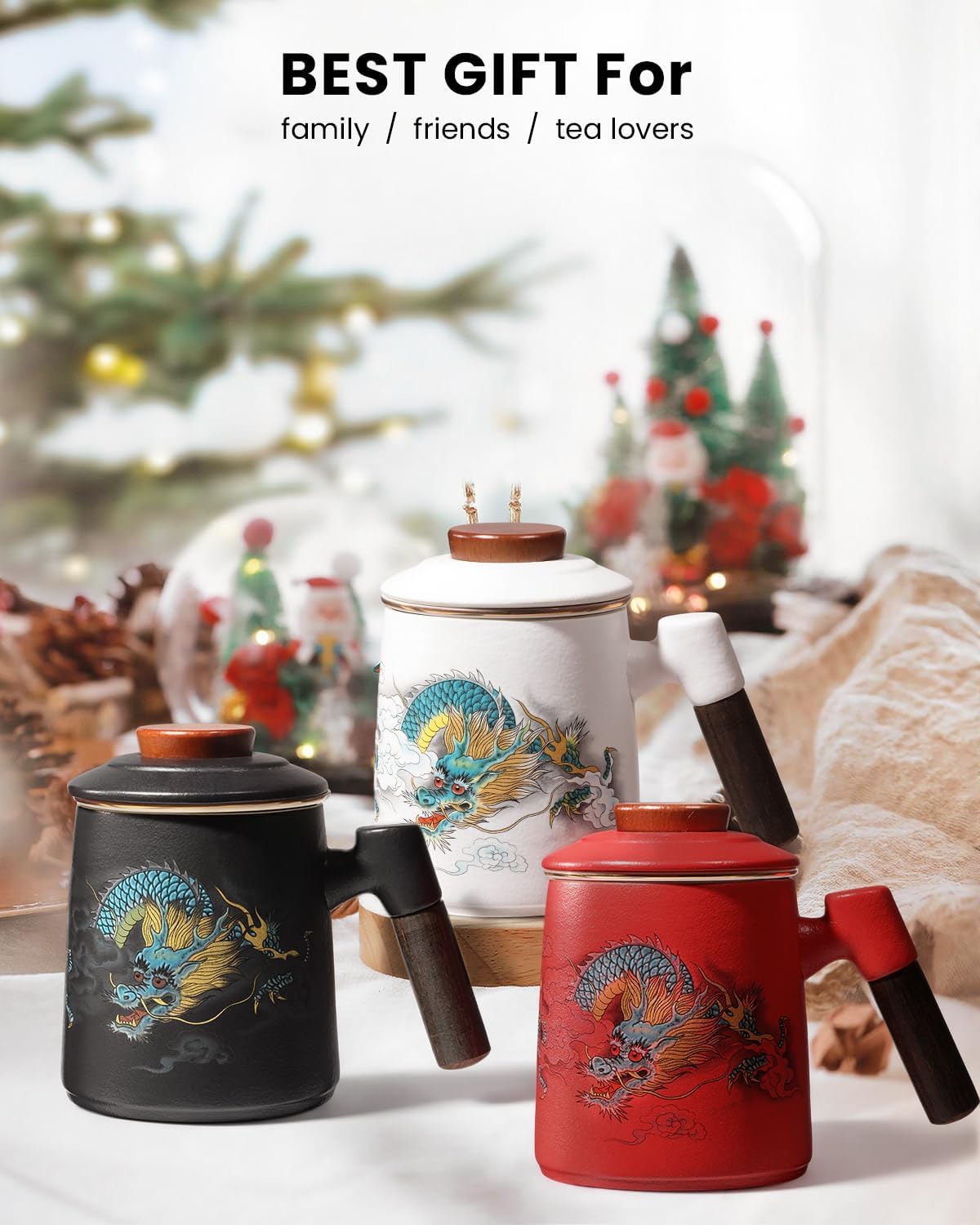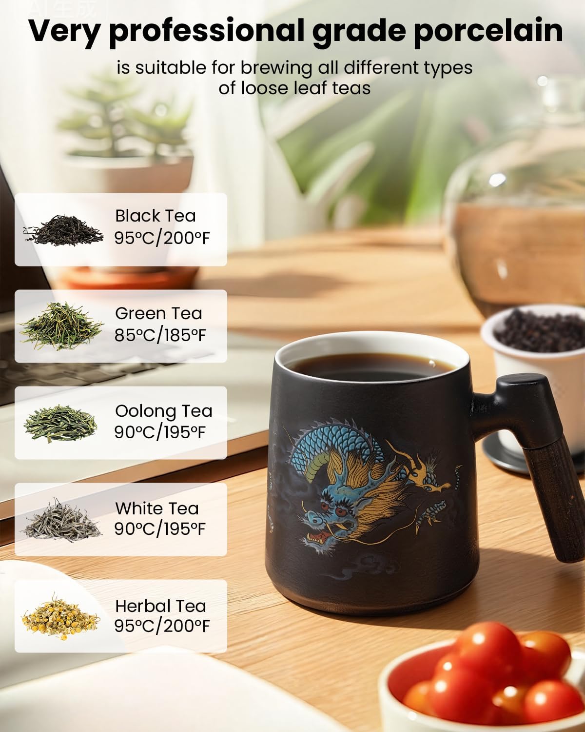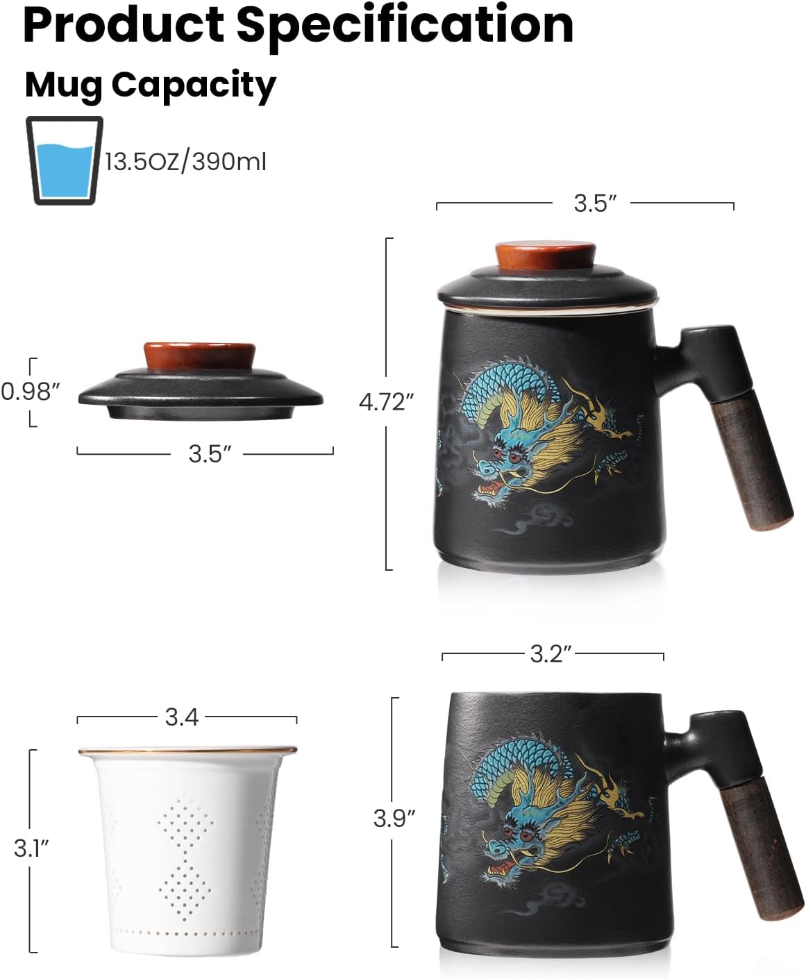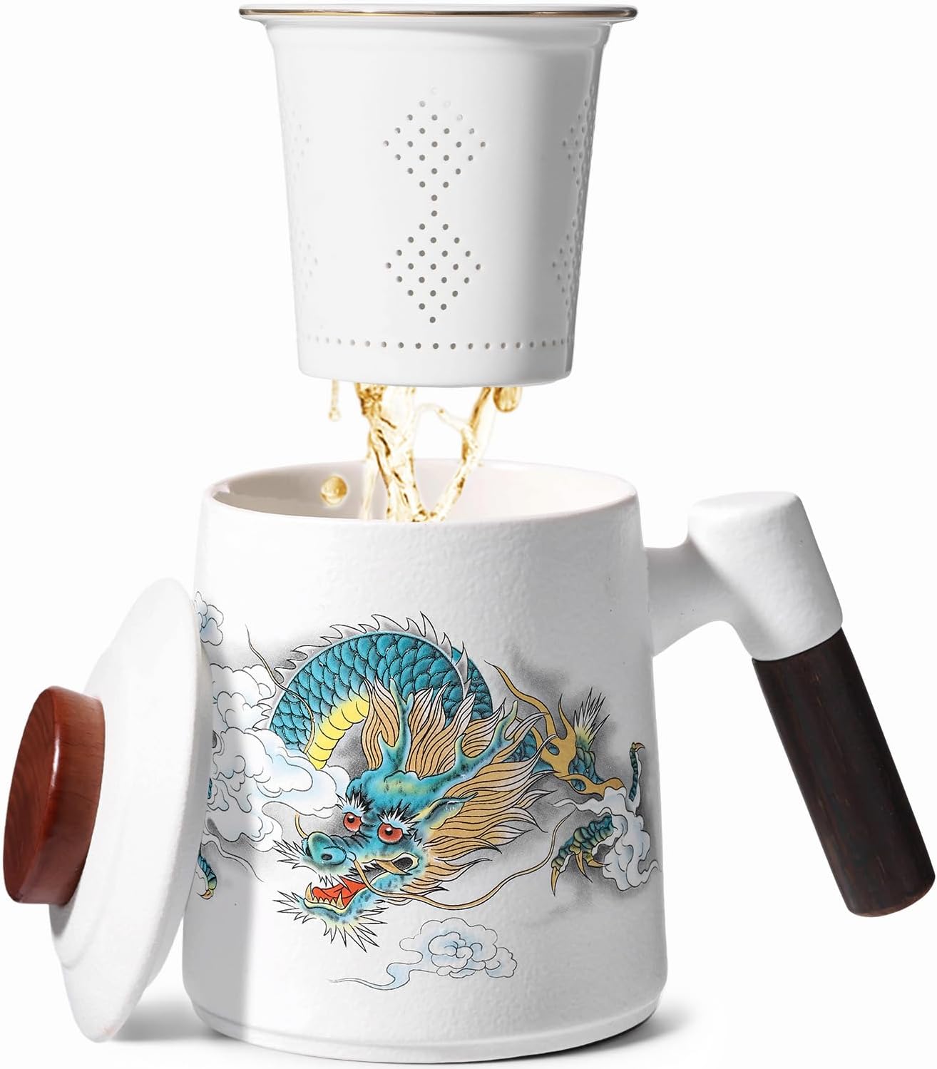Porcelain Tea Cup with Infuser and Lid,Ceramic Tea Mug for Loose Leaf,Tea Strainer Cup with Wood Handle,Chinese Dragon Black Cup,All Ceramic Infuser,BPA-Free for Tea Lovers/Birthday/Valentine’s Day