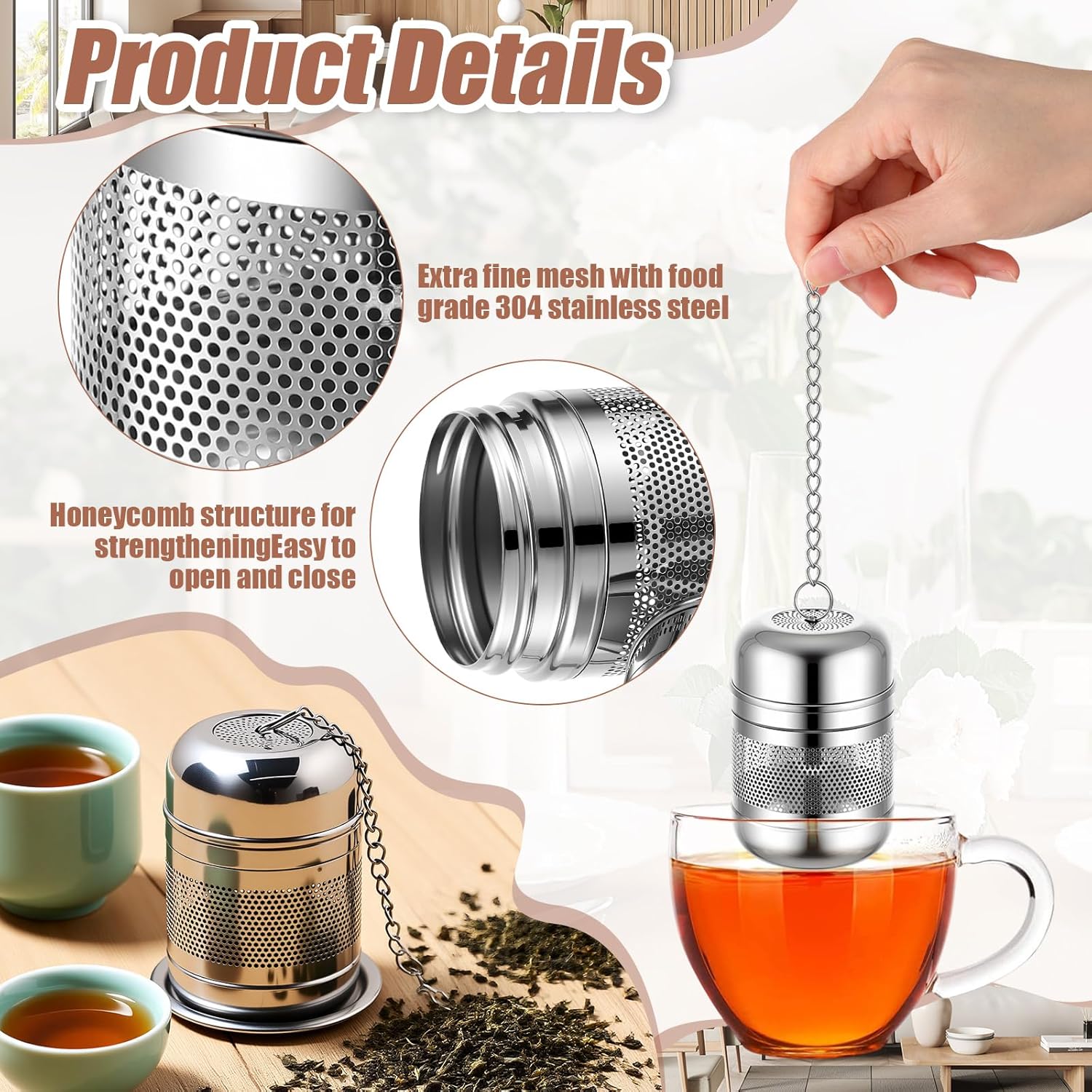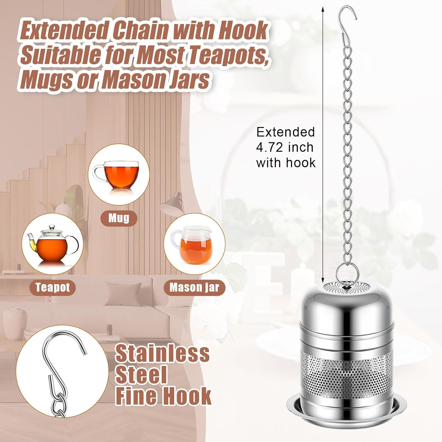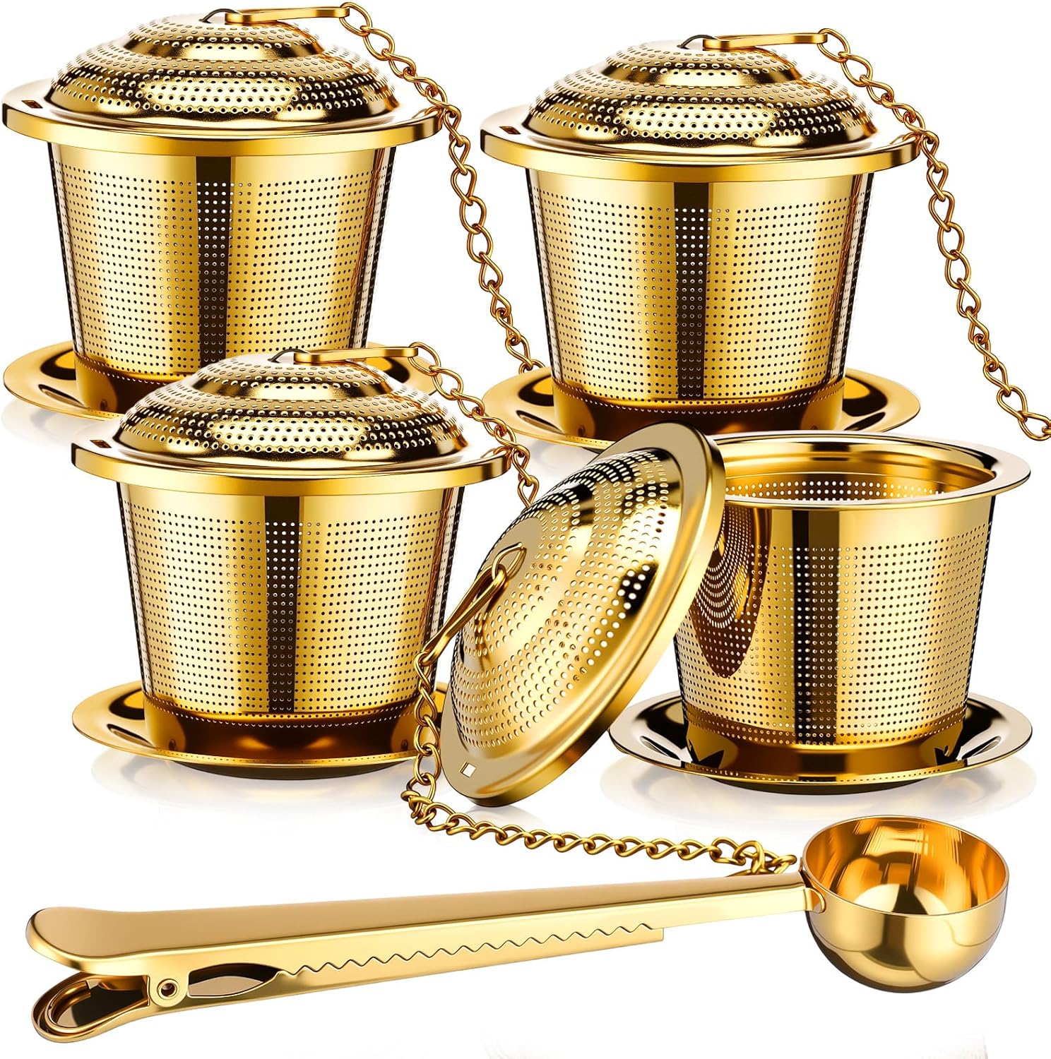 Umigy 4 Pcs Tea Infuser Strainers for Loose Tea with Scoop, Extra Fine Mesh Steeper 304 Stainless Steel Diffuser Leaf Holder with Extended Chain Hook for Brew, Spices, Seasoning (Stylish Style)
