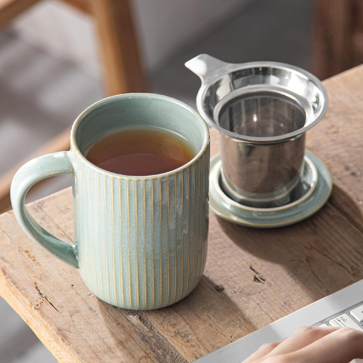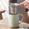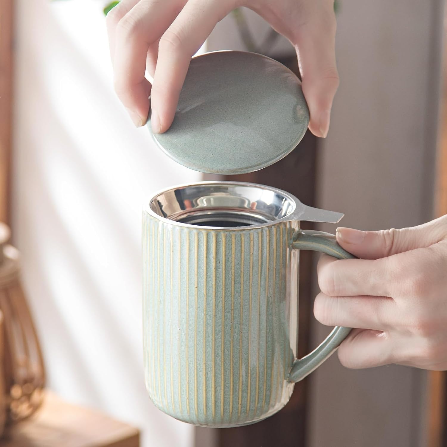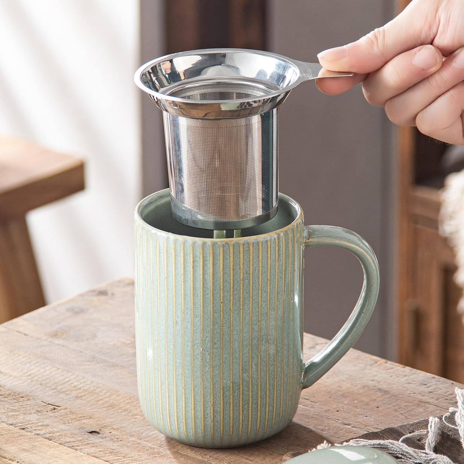 Yundu 15.5oz/470ml Flambe Green Ceramics Teacups with Infuser and Lid, Loose Leaf Tea Cup